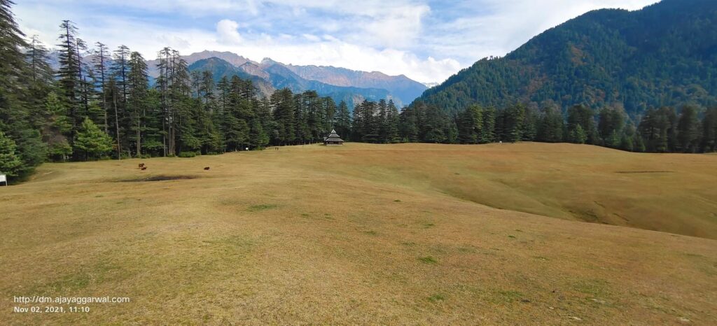 At the heart of Shangarh lies the Shangarh Meadow, a vast green field with the Shangchul Mahadev Temple standing proudly on one side. The sight of that open meadow, framed by dense deodar forests and snow-capped peaks, felt almost surreal. It was peaceful in a way that words can’t fully describe.